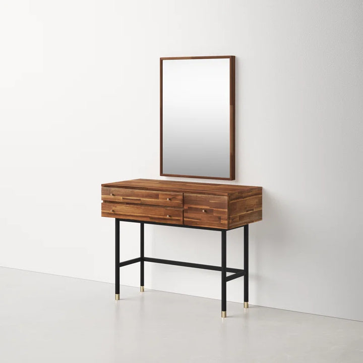 Classic designs, updated construction. Crafted from solid acacia wood with a black frame and gold foot caps, this vanity and mirror combo create high-contrast retro vibes. Built-in compartments in the drawers keep everything from rolling around. The mirror mounts or leans against to your wall both horizontally or vertically.